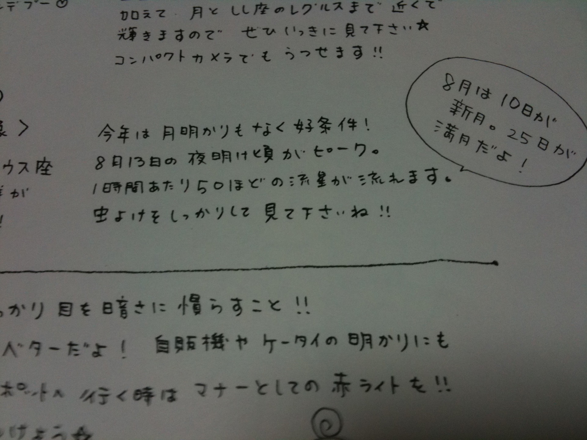 ・8月13日にペルセウス座流星群が極大。ひとつのところを見ないで全体を見るような感じがよい。目は怪しい感じでw